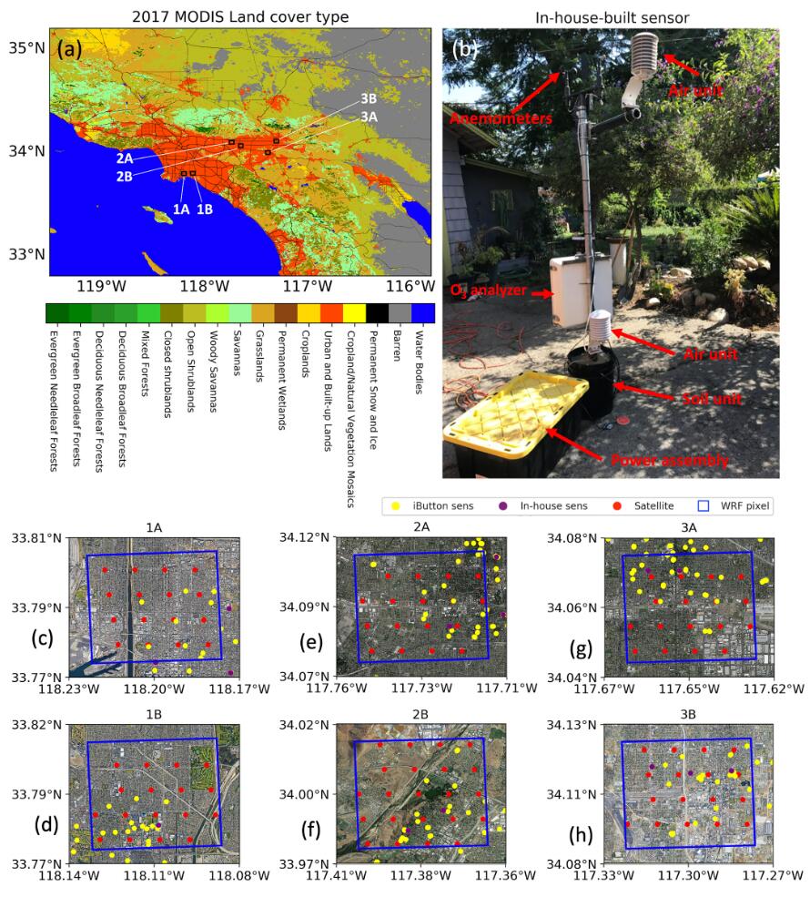 我們?cè)O(shè)計(jì)了我們的研究,以評(píng)估2017 年夏季從單個(gè)地塊到洛杉磯大都市區(qū)(圖 1a )的多個(gè)尺度的溫度和 O 3變化。我們圍繞單個(gè)社區(qū)組織了傳感器部署,我們將其定義為 4 × 4 km 2樣方. 密集的現(xiàn)場(chǎng)部署集中在加利福尼亞州長(zhǎng)灘和內(nèi)陸帝國(guó)的各個(gè)部分(圖 1c-1h),這是洛杉磯大都市地區(qū)的一個(gè)子集,嚴(yán)重未達(dá)到 O 3. 部署持續(xù)時(shí)間分為三個(gè)活動(dòng)。在 2017 年 6 月至 7 月的第一次活動(dòng)中,六個(gè)傳感器節(jié)點(diǎn)被分布到長(zhǎng)灘附近距離小于 20 公里的兩個(gè)樣方(每個(gè)樣方三個(gè)傳感器節(jié)點(diǎn))(例如,圖 1中的樣方 1A 和 1B) . 通過這種設(shè)計(jì),樣方大小可與空氣質(zhì)量模型和 EPA 排放清單的標(biāo)稱空間分辨率相媲美,后者通常為 4 × 4 km 2,而兩個(gè)樣方之間的距離可與 TROPOMI 足跡的尺寸相媲美( 4 × 7 公里2) 在更低點(diǎn)。因此,社區(qū)科學(xué)網(wǎng)絡(luò)的分布非常適合進(jìn)行測(cè)量,以解決有關(guān)亞網(wǎng)格尺度模型不確定性和亞像素分辨率衛(wèi)星檢索不確定性的問題。2017 年 7 月至 8 月的第二次活動(dòng)和 2017 年 8 月至 9 月的第三次活動(dòng)的部署與第一階段的部署類似,但針對(duì)克萊蒙特(圖 1中的 2A 和 2B )和圣貝納迪諾(3A)附近的不同樣方和3B),分別。當(dāng)兩個(gè)樣方在項(xiàng)目的每個(gè)階段配對(duì)以測(cè)量子區(qū)域梯度預(yù)期溫度和 O 3時(shí),項(xiàng)目所有三個(gè)階段中的鄰域?qū)Χ急贿x擇以共同反映區(qū)域梯度。